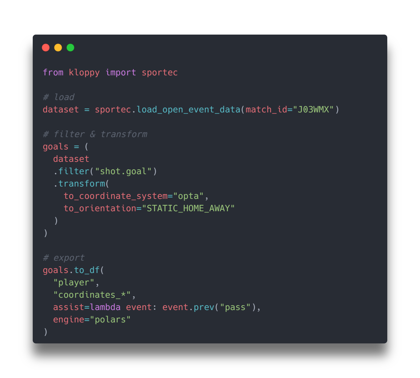Once you have all the data in the right shape, export it as a Polars or Pandas dataframe to perform efficient data analysis, or as SportsCode XML to support your video analysis workflow. Kloppy's data model is also compatible with other popular soccer analytics libraries.